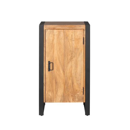 Halkast Boaz combineert de warme uitstraling van mangohout met stoere zwarte metalen accenten. Deze compacte kast met één deur biedt praktische opb...